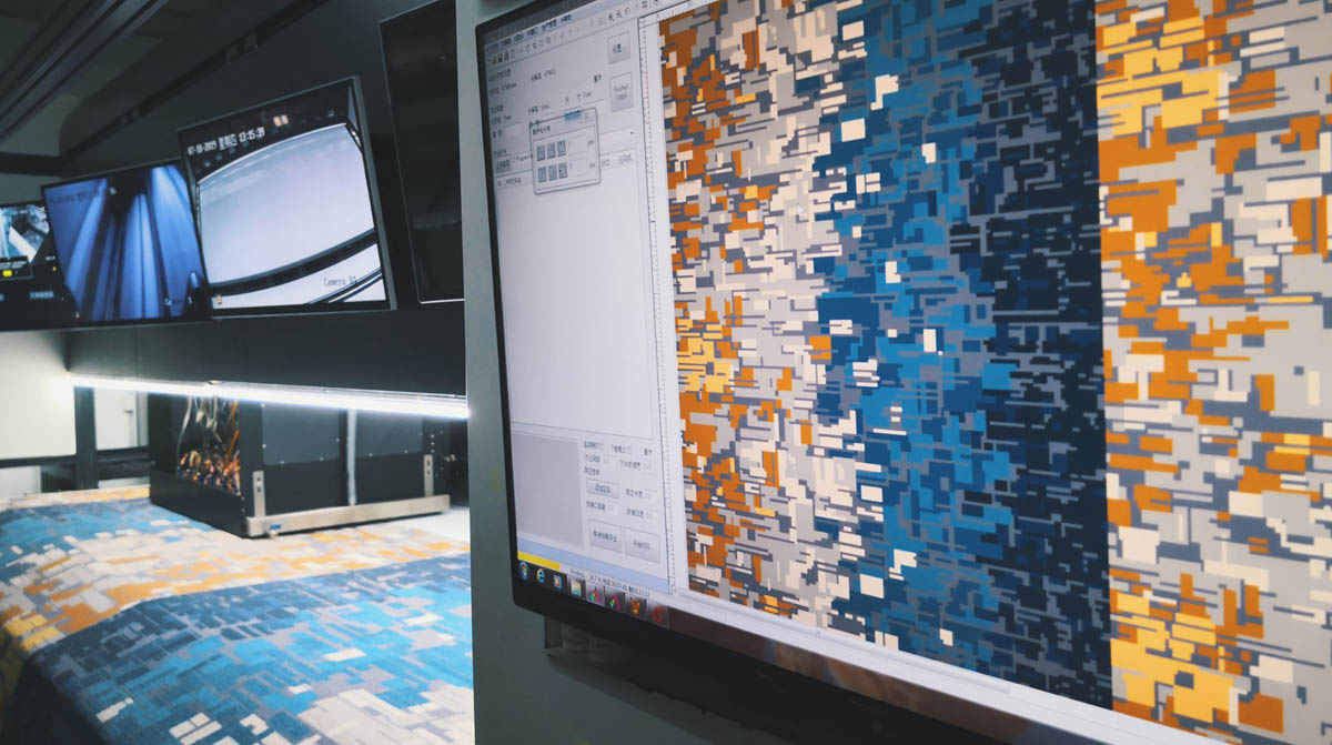 鸿成当前生产体系,核心原理是依托强大数据链实现全域整合。该体系以公司自研的ERP&MES 系统为中枢,串联小程序高速订制接单系统、VACLS-AI 可视化自动地毯排版下单系统、服务器排版算法系统、智能立体仓库系统及数据高清打印系统五大模块。小程序接单系统与 AI 订单系统接收订单后,数据链将同步服务器排版算法。排版算法系统会自动生成排版方案、上机图、标签数据、生产数据及包装数据,并通过邮件或网页端自动通知客户。随后,数据链将分别传至机台系统与智能立体仓库系统:仓库自动检索、调取所需坯毯,精准传送至机台上毯工位;机台系统则自动调用上机图完成打印,机台长无需执行复杂操作。打印完成后,系统将指挥成品地毯回存入智能立体仓库。客户下达出运指示后,获授权发货人员在全球任意地点发送指令,即可触发立体仓库精准出库,完成货物发运。