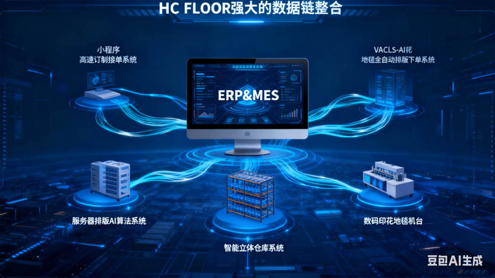 鸿成当前生产体系,核心原理是依托强大数据链实现全域整合。该体系以公司自研的ERP&MES 系统为中枢,串联小程序高速订制接单系统、VACLS-AI 可视化自动地毯排版下单系统、服务器排版算法系统、智能立体仓库系统及数据高清打印系统五大模块。小程序接单系统与 AI 订单系统接收订单后,数据链将同步服务器排版算法。排版算法系统会自动生成排版方案、上机图、标签数据、生产数据及包装数据,并通过邮件或网页端自动通知客户。随后,数据链将分别传至机台系统与智能立体仓库系统:仓库自动检索、调取所需坯毯,精准传送至机台上毯工位;机台系统则自动调用上机图完成打印,机台长无需执行复杂操作。打印完成后,系统将指挥成品地毯回存入智能立体仓库。客户下达出运指示后,获授权发货人员在全球任意地点发送指令,即可触发立体仓库精准出库,完成货物发运。
